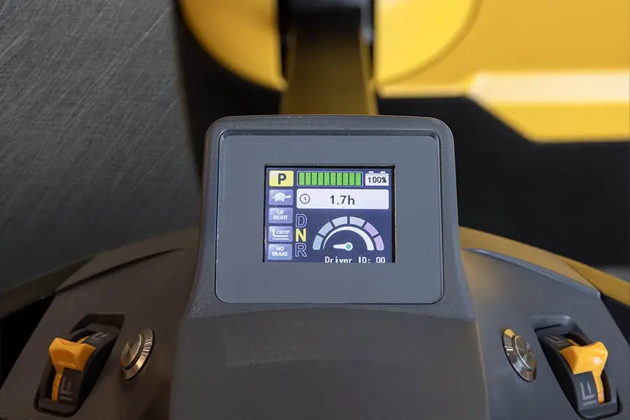 La manija del timón multifunción está colocada en una cómoda posición central para que ambas manos puedan accionar todas las funciones de desplazamiento o elevación. Una pantalla inteligente en la manija proporciona información al operario cómodamente.